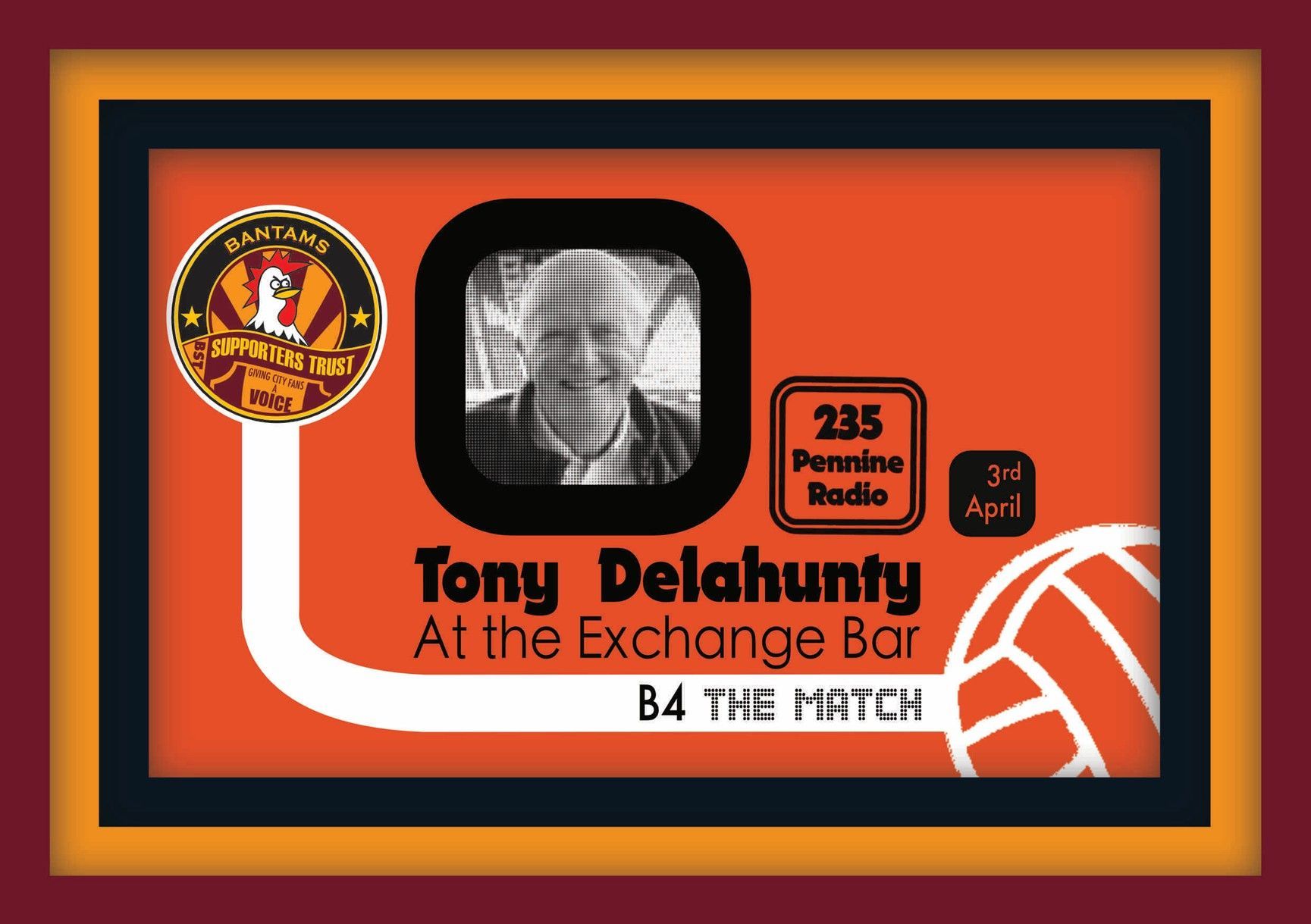 For those City fans of a certain age, tuning into Pennine Radio for the football in West Yorkshire in the early 80’s, you may remember the familiar voice of Tony Delahunty commentating on the fortunes of Bradford City up and down the country. Well, he will be appearing at what many of us remember as the old Ale Exchange this Friday, raising money for the Burns Unit. On the 3 rd of April, before the Northampton game, Tony will be speaking at the Exchange Craft Beer House about his stories during his time commentating on the City action. Tony was commentating on the tragic day of the fire. Now 82, Tony is retiring from radio. In recent years he ran an independent radio station, Mansfield 103.2. The Trust has helped organise this event and he is now an Honorary Patron of the Trust for being a great servant to Bradford in the past and as sports commentator around the world. Tony will be at the bar from 12 so come down and see him and raise a glass and make a donation for the Burns Unit. We hear he tells some good stories! He will be at the Ale Exchange for only an hour, as he will be treated at the Club before the match as well.